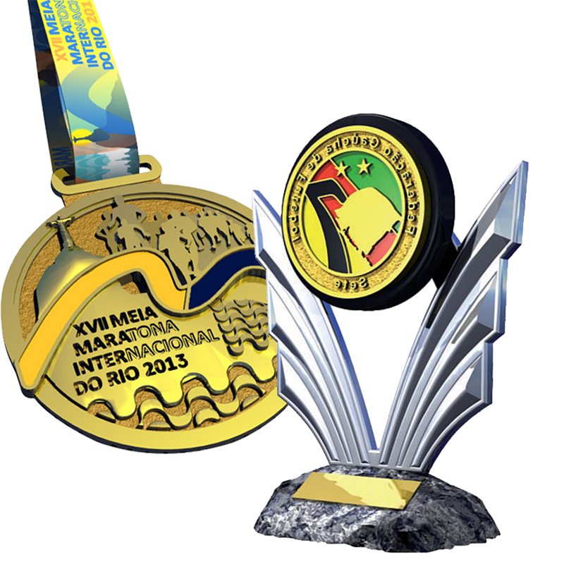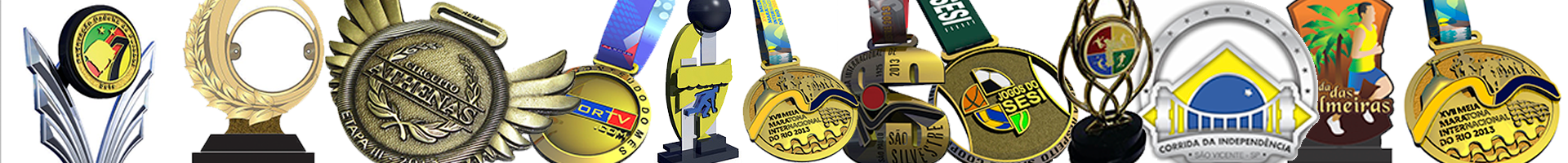 Medalhas, troféus, camisetas 100% poliamida, sacolas, sacochilas, bonés e toalhas.