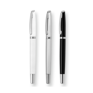 Caneta de metal roller com escrita em preto.