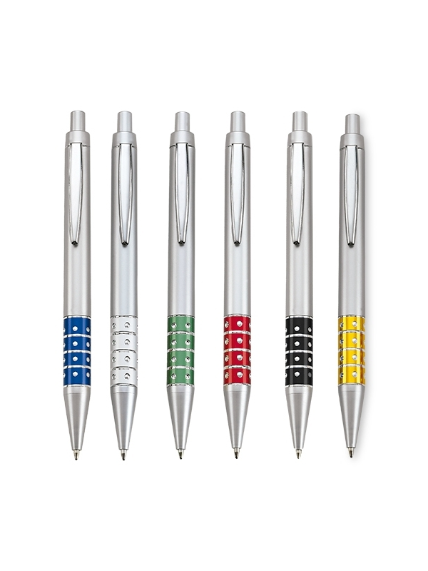 Caneta esferográfica retrátil em material plástico.